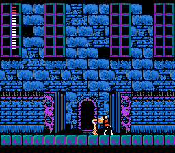Ahora tengo 5 líneas de vida, y las juzgo suficientes para superar esta Mansión, pues en breve subiré de nivel (o eso creo) y tanto mi energía como el poder del látigo aumentarán, y apenas estoy en esta que se supone debía ser la primera Mansión a pasar. Entro. Esa base azul que se mira aparece porque estoy usando el cristal azul, de otro modo sería invisible. Gasto unos instantes para estudiar su patrón, y descubro el modo de no perder una vida cuando es invisible: todo lo que hay que hacer es que una vez entrando hay que avanzar sin parar y saltar al agua como si quisiésemos cometer suicidio (en estos tiempos no había cursos de natación) y en el aire se aterriza en la susodicha base invisible.